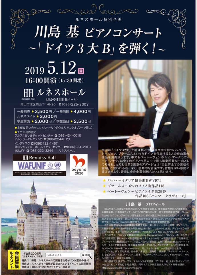 Klavierabend [Programm] J.S.Bach:Italienisches Konzert BWV971 Brahms:6 Klavierstücke, Op.118 Beethoven:Klaviersonate Nr.29 B-Dur op. 106 („Hammerklaviersonate”) Okayama(JP) Renaiss Hall 16:00 |