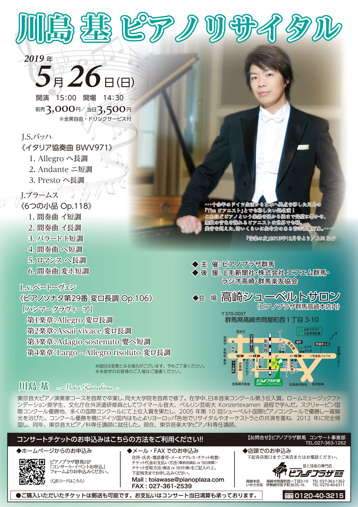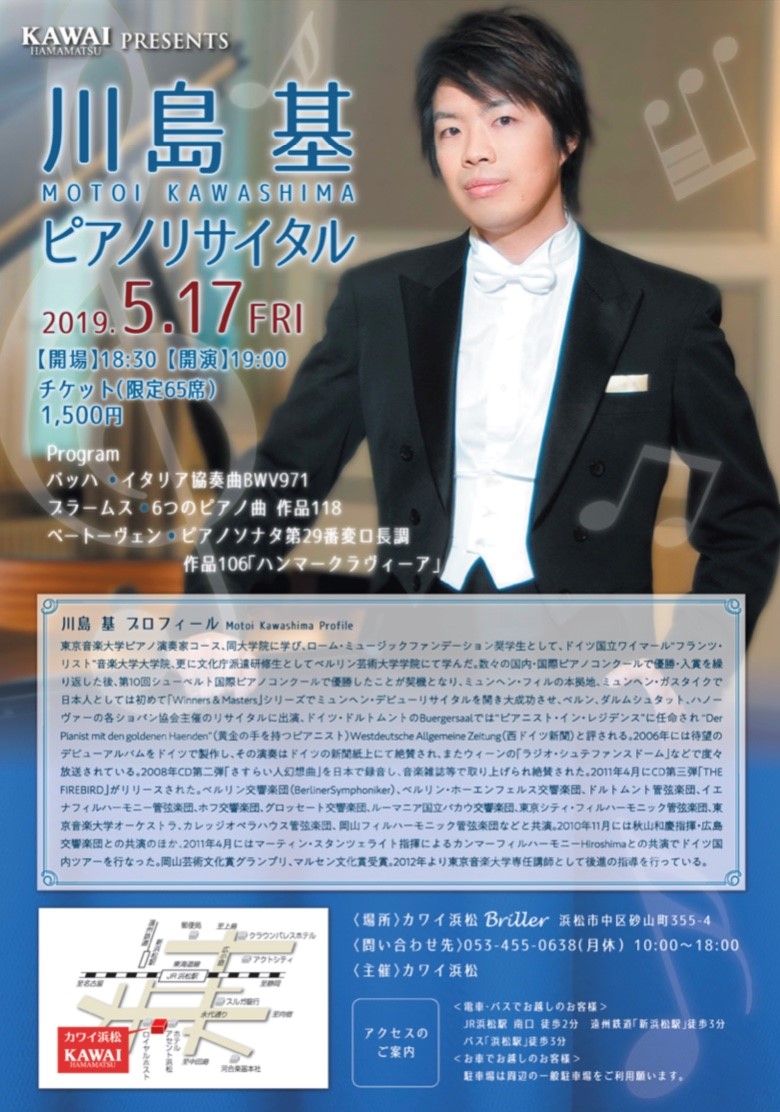 Klavierabend [Programm] J.S.Bach:Italienisches Konzert BWV971 Brahms:6 Klavierstücke, Op.118 Beethoven:Klaviersonate Nr.29 B-Dur op. 106 („Hammerklaviersonate”) Hamamatsu(JP) Kawai Hamamatsu "Briller" 19:00 |