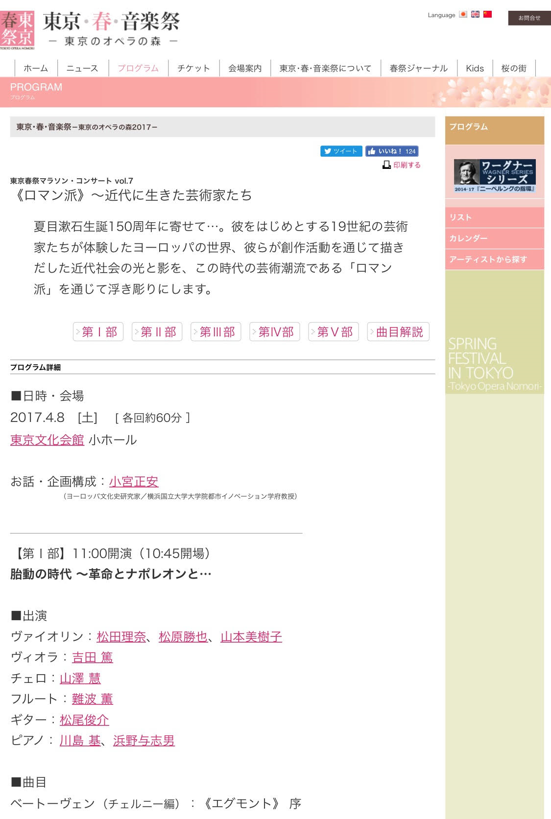 | 2017.04.08 | 東京・春・音楽祭 - 東京のオペラの森 - 東京春祭マラソン・コンサート vol.7 《ロマン派》~近代に生きた芸術家たち 【場所】東京 【会場】東京文化会館 小ホール 【開演】[第一部]11:00-12:00 [第五部]19:00-20:00 各回60分 全5回 【音楽祭のサイト】 東京・春・音楽祭 |   | ||