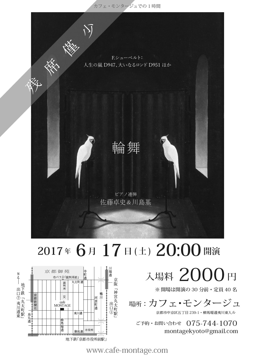 | 2017.06.17 | シューベルト 4手連弾 佐藤卓史&川島基 シューベルト:序曲 ト短調 D668 シューベルト:序奏、創作主題による4つの変奏曲とフィナーレ 変ロ長調 D968A 作品82-2 シューベルト:アレグロとアンダンテ ハ長調/イ短調 D968 シューベルト:アレグロ イ短調 D947 作品144「人生の嵐《 シューベルト:ロンド イ長調 D951 作品107 【場所】京都 【会場】カフェ モンタージュ 【開演】20:00 【お問い合わせ】 カフェ モンタージュ 京都市中京区五丁目239-1 ℡:075-744-1070 Email: montagekyoto@gmail.com カフェ モンタージュのサイト 【佐藤卓史さんのホームページ】 佐藤卓史公式ウェブサイト |   | ||