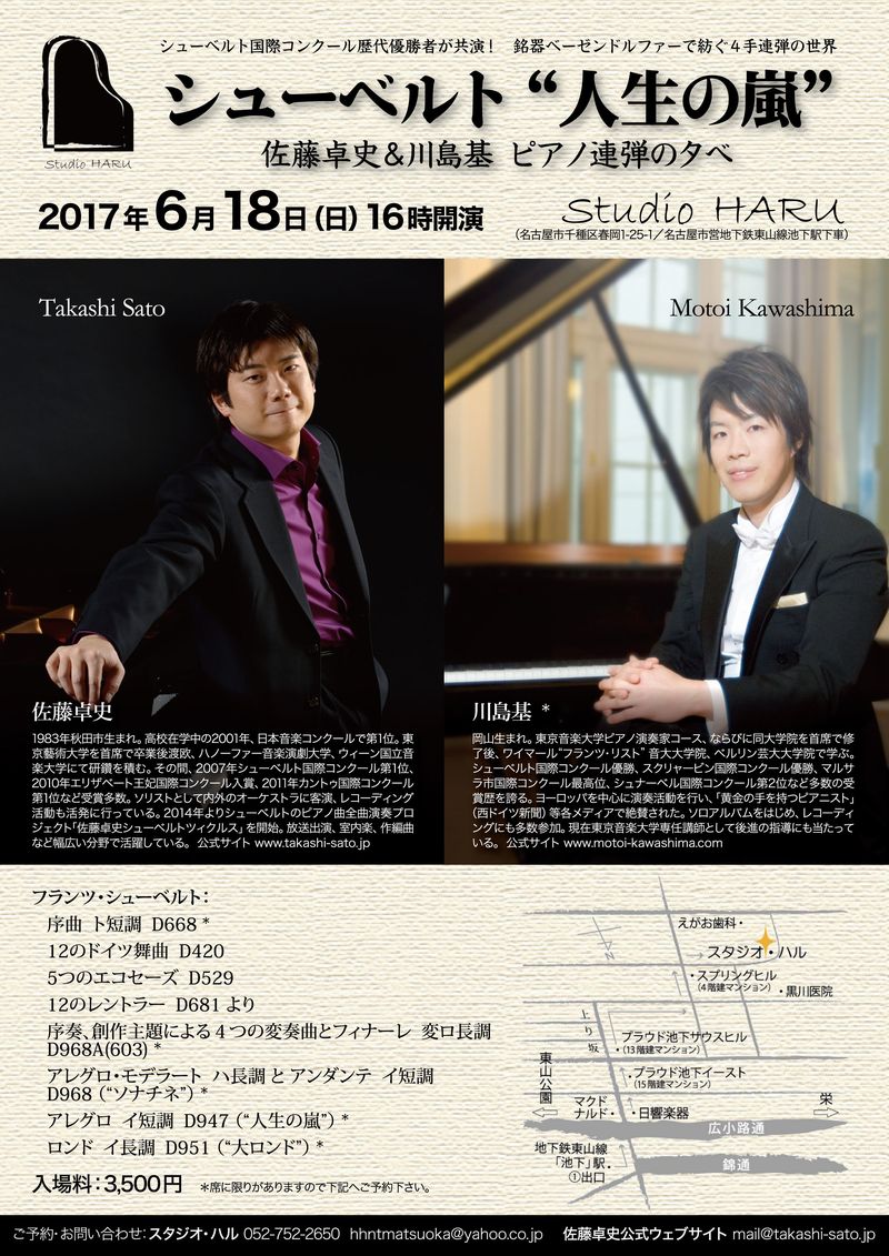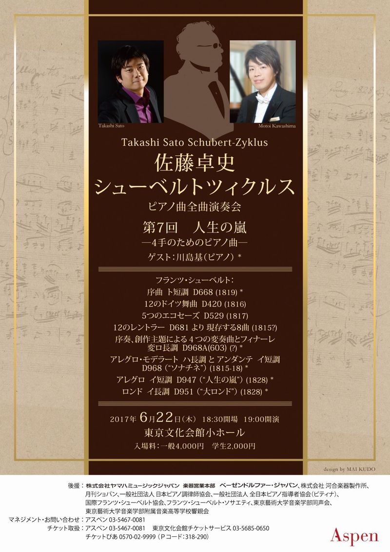 | 2017.06.22. | シューベルト“人生の嵐” 佐藤卓史&川島基 ピアノ連弾の夕べ 【プログラム】 シューベルト:序曲 ト短調 D668 * シューベルト:8つのレントラー D681 シューベルト:12のドイツ舞曲 D420 シューベルト:12のエコセーズ D529より 第5~12曲 シューベルト:序奏、創作主題による4つの変奏曲とフィナーレ 変ロ長調 D968A 作品82-2 * シューベルト:アレグロとアンダンテ ハ長調/イ短調 D968 * シューベルト:アレグロ イ短調 D947 作品144「人生の嵐《 * シューベルト:ロンド イ長調 D951 作品107 * *印の曲を演奏します。 【場所】吊古屋 【会場】STUDIO HARU 【開演】16:00 【お問い合わせ】 スタジオ・ハル TEL:052-752-2650 hhntmatsuoka@yahoo.co.jp 【佐藤卓史さんのホームページ】 佐藤卓史公式ウェブサイト |   | ||