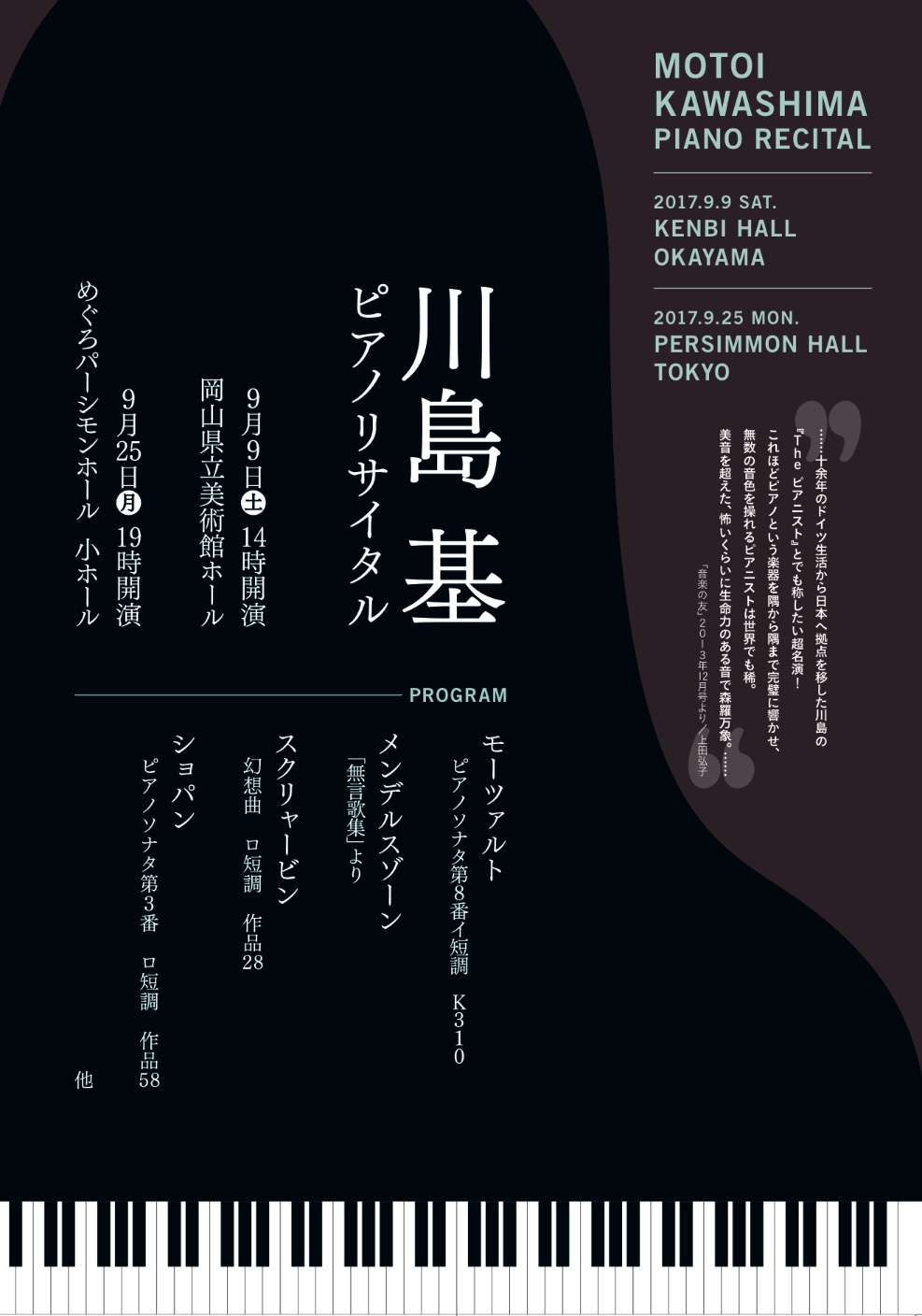 | 2017.09.09 | 川島基 ピアノリサイタル 【場所】岡山 【会場】岡山県立美術館ホール 【開演】14:00 (開場13:30) 【主催】ヤマハミュージックリテイリング 岡山店 【チケットの申し込み】 ヤマハミュージック岡山店・倉敷店、岡山シンフォニーホールチケットセンター、ぎんざや、ルネスホール 【お問い合わせ】 ヤマハミュージックリテイリング 岡山店 TEL:086-224-5331 【プログラム】 モーツァルト:ピアノソナタ8番イ短調 K310 メンデルスゾーン:無言歌集より スクリャービン:幻想曲 ロ短調 作品28 ショパン:ピアノソナタ第3番 ロ短調 作品58 ほか |   チラシPDF | ||