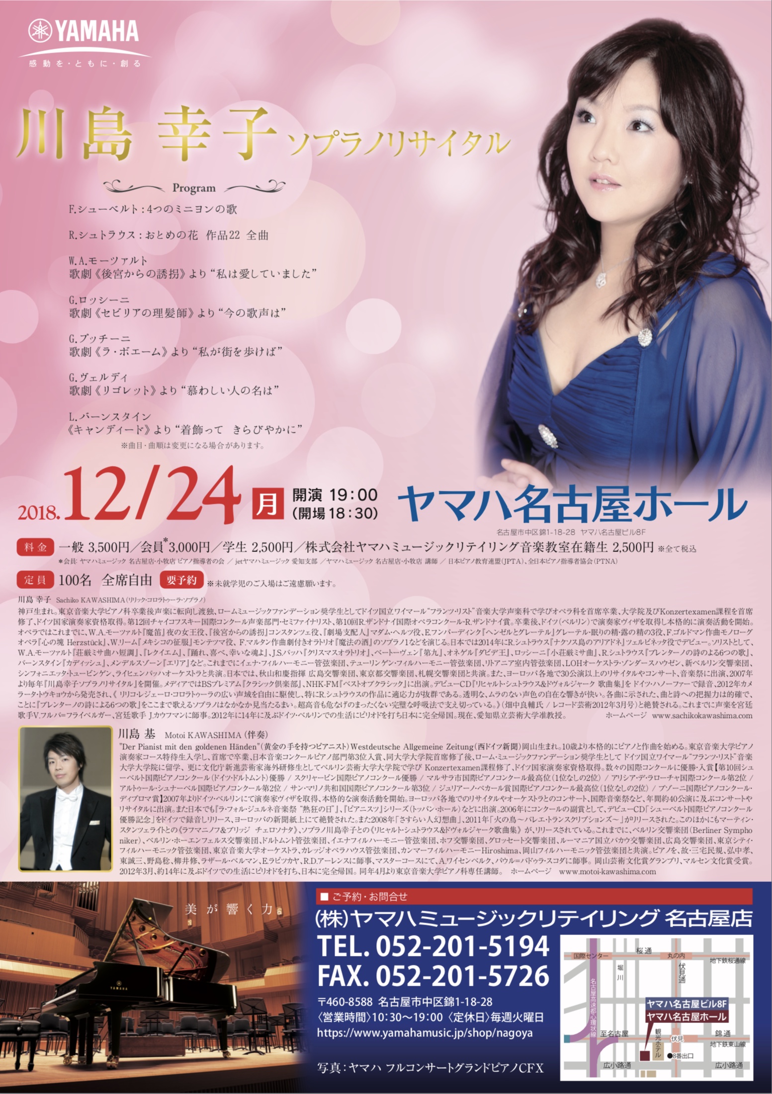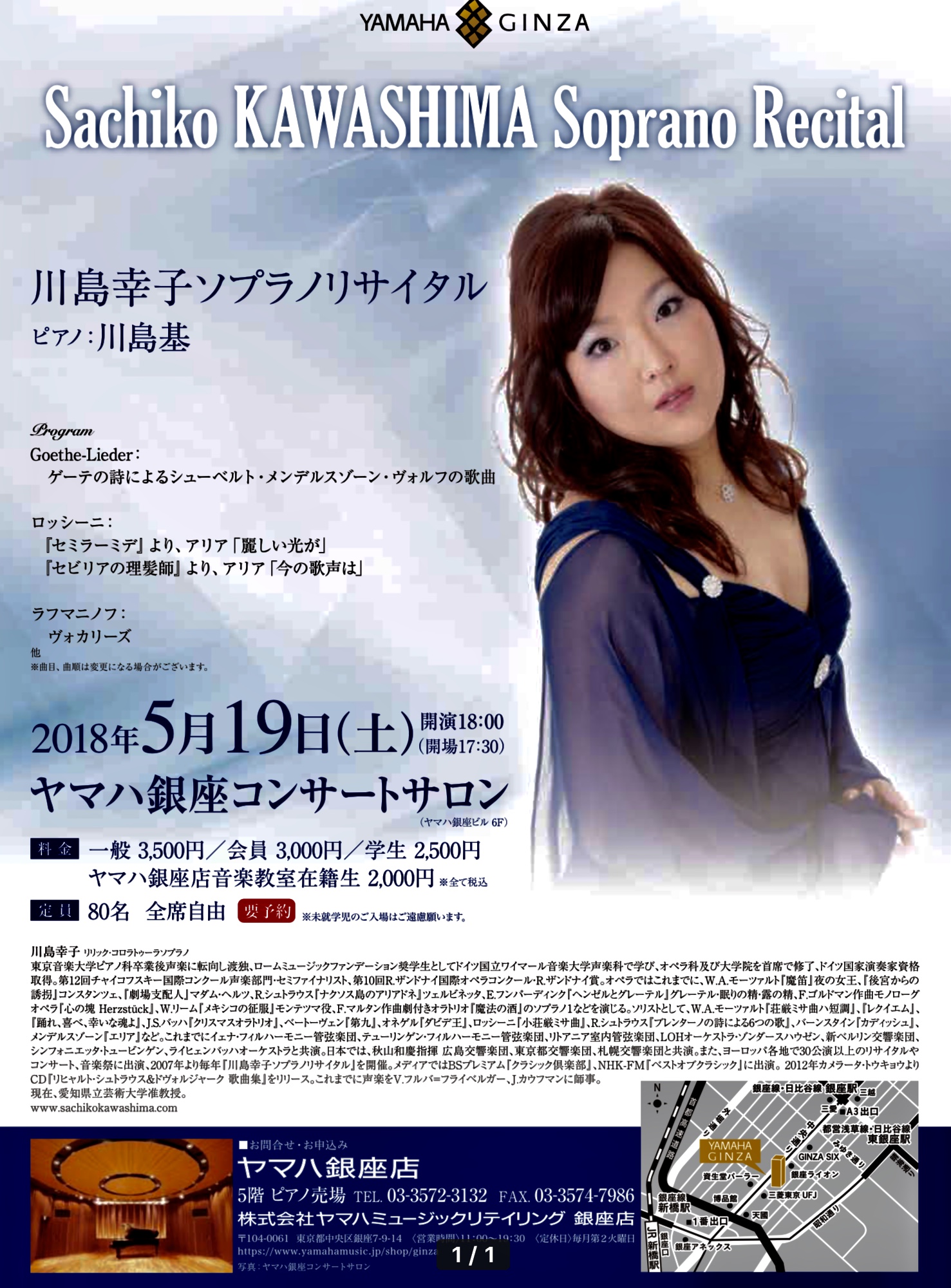川島幸子ソプラノリサイタル 【共演】川島幸子(ソプラノ) 【場所】東京 【会場】ヤマハ銀座コンサートサロン 【開演】18:00(17:30開場) |